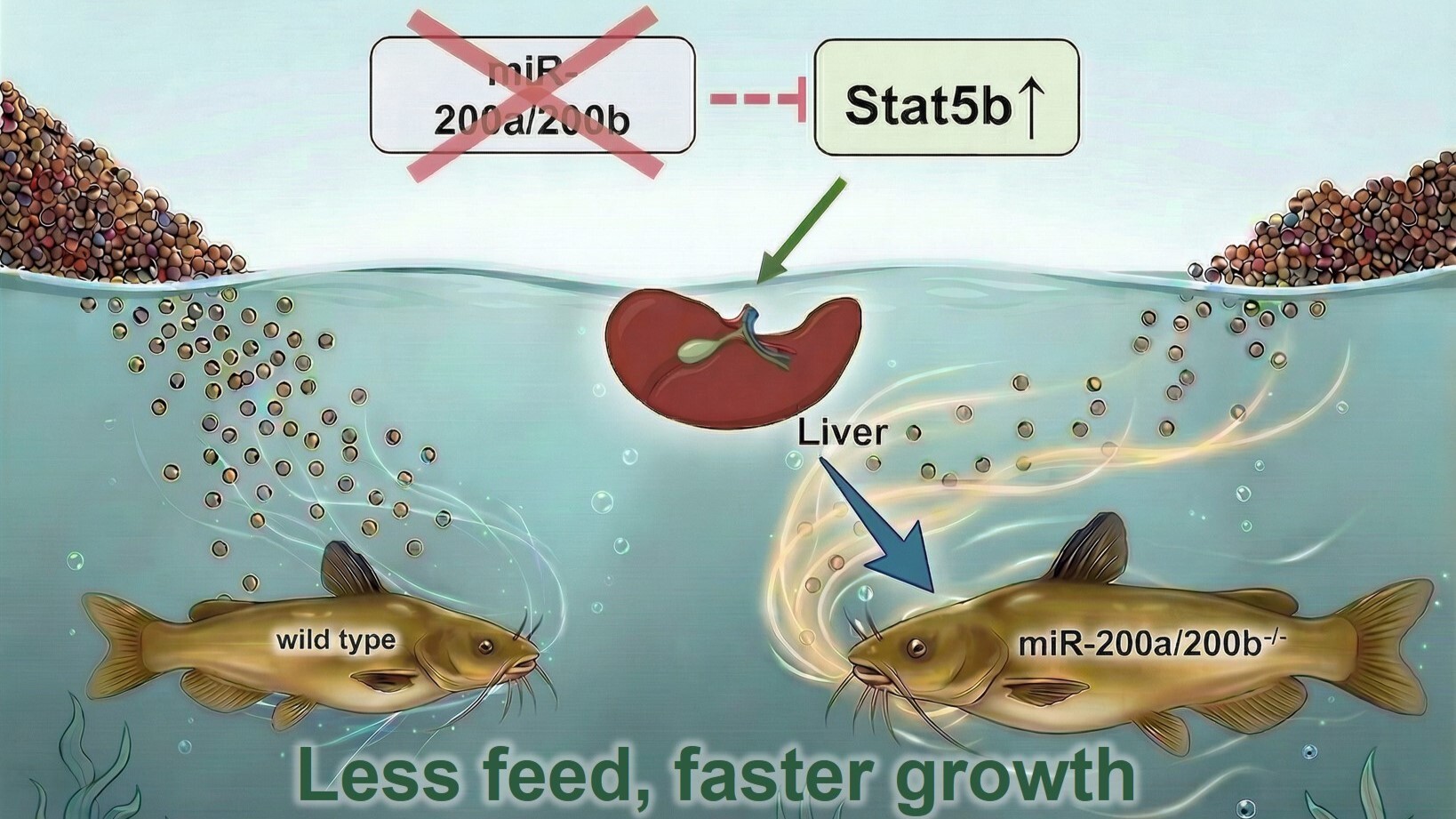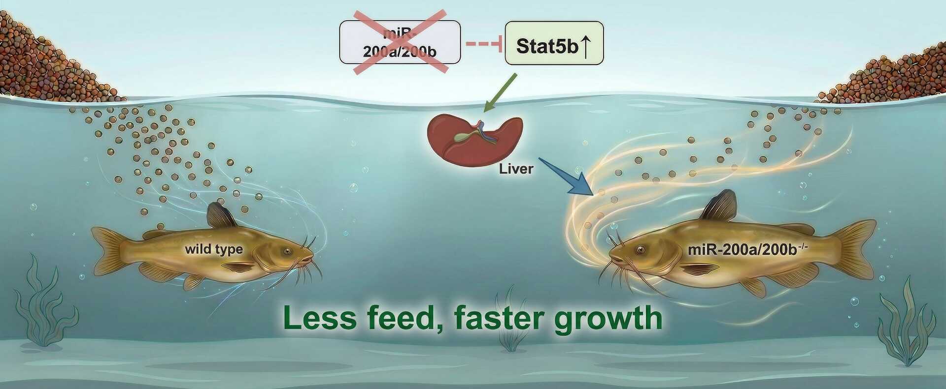 A research group led by Prof. MEI Jie from the Institute of Hydrobiology (IHB) of the Chinese Academy Sciences found that miR-200a/200b deficiency enhances growth and FCE in yellow catfish (Pelteobagrus fulvidraco) through upregulating Stat5b expression.