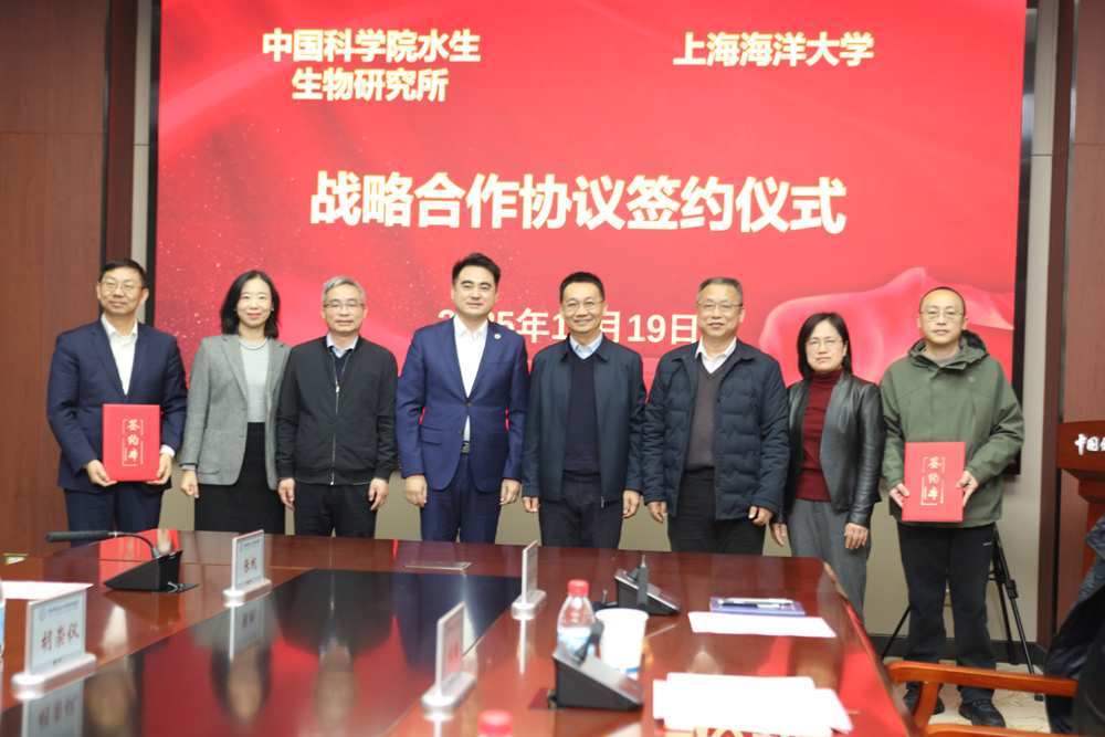 On December 19, 2025, Shanghai Ocean University (SHOU) and the Institute of Hydrobiology (IHB) of the Chinese Academy of Sciences formally entered into a strategic partnership. The agreement was signed during a visit by a SHOU delegation led by university council chairperson WANG Hongzhou, university council vice vhairperson and president HU Wei, university council vice chairperson and vice president XIA Yamin, and vice president LUO Yi.