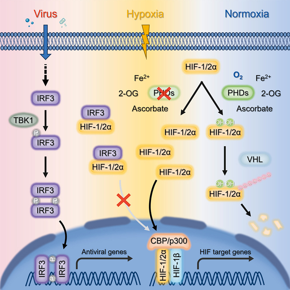 In this study, the researchers discovered that IRF3 negatively regulates the hypoxia signaling pathway. The suppressive role of IRF3 on hypoxia signaling depends on its localization in the cytosol. Knockout of IRF3 enhances hypoxia response gene expression and potentiates cellular hypoxia adaptation.