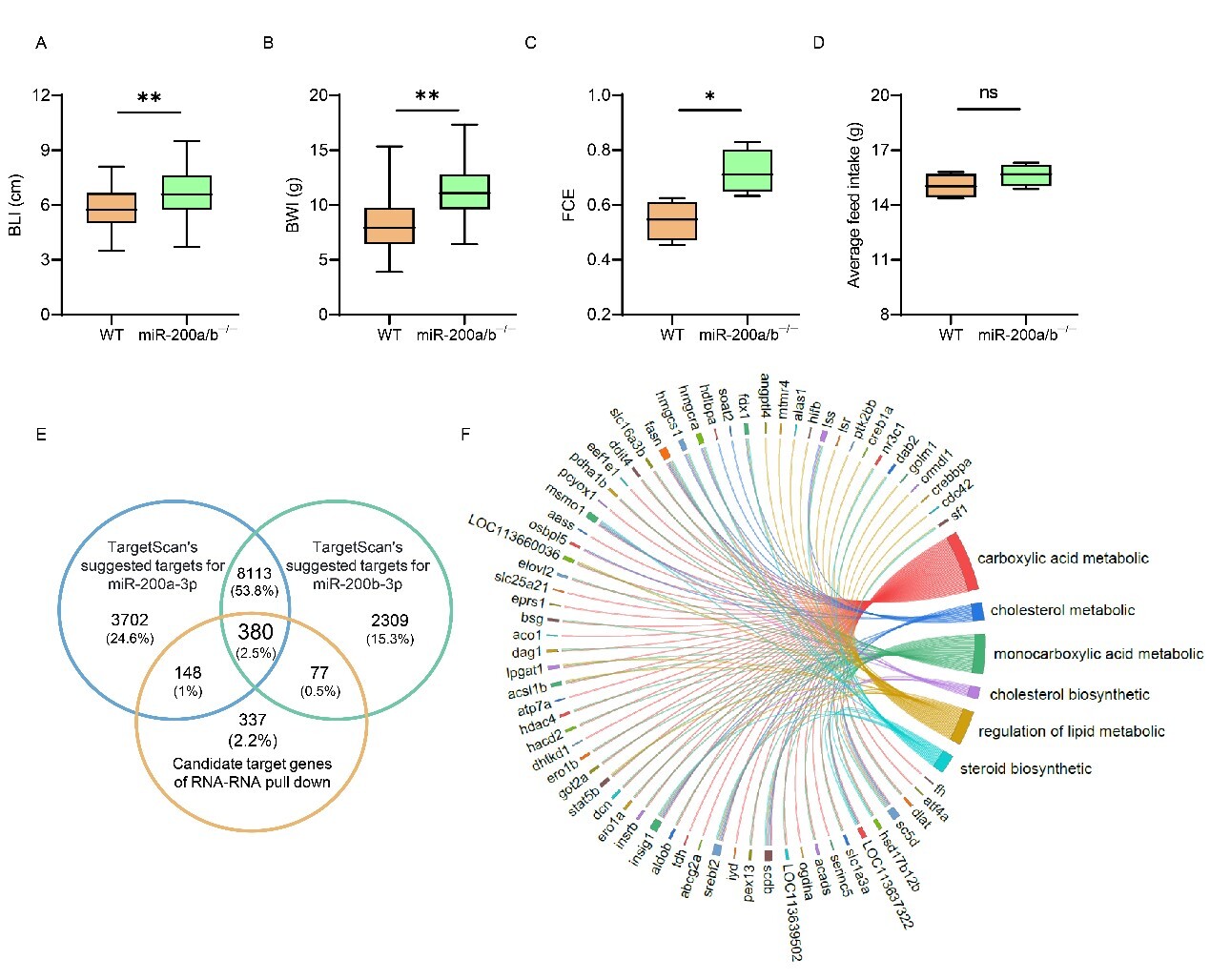These findings indicate that miR-200a/200b enhances nutrient utilization mainly by regulating energy metabolism-related target genes and signaling pathways, providing important theoretical support and technical guidance for dissecting the coupling mechanism of high yield and feed-saving traits and for the precise genetic improvement of these traits.